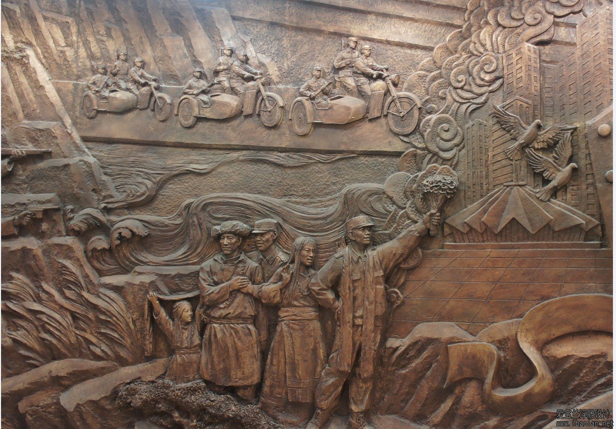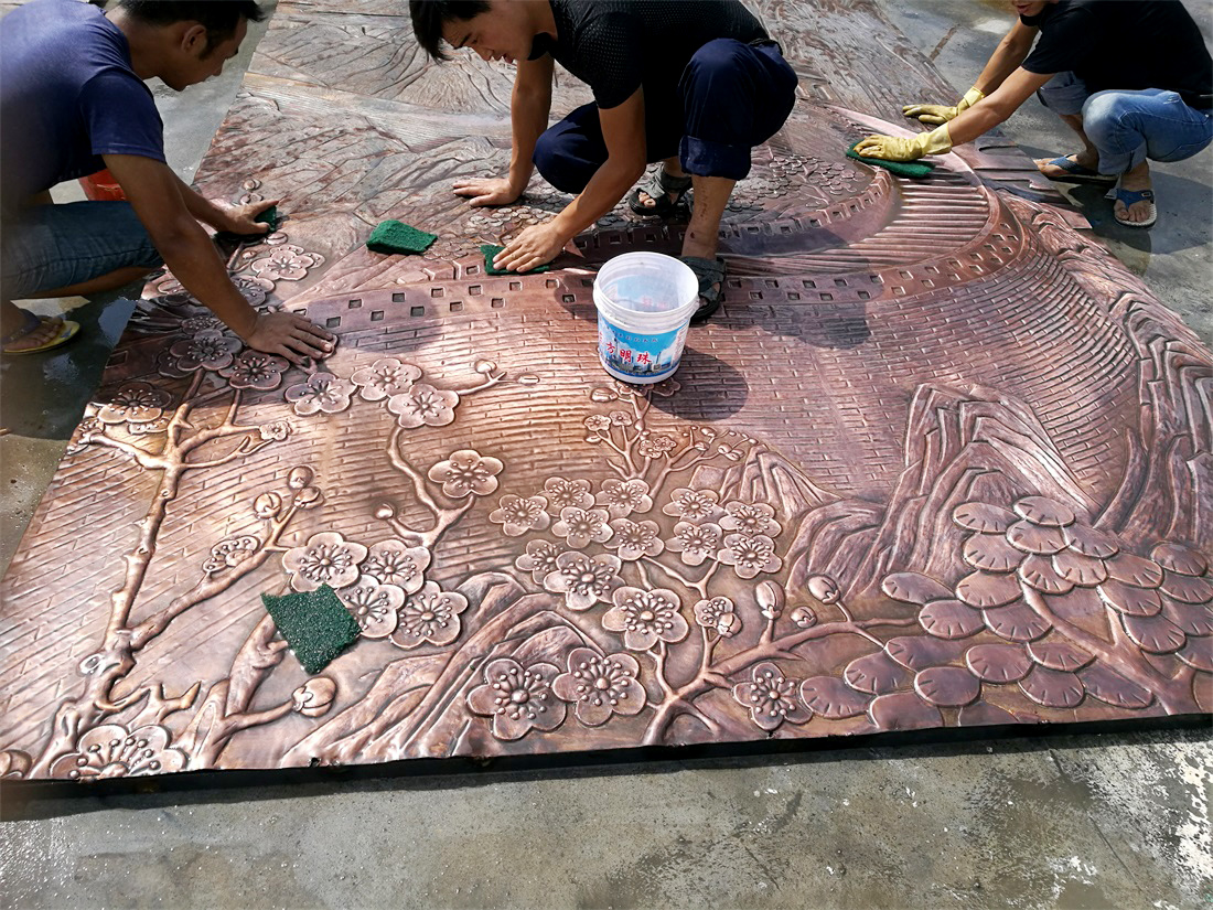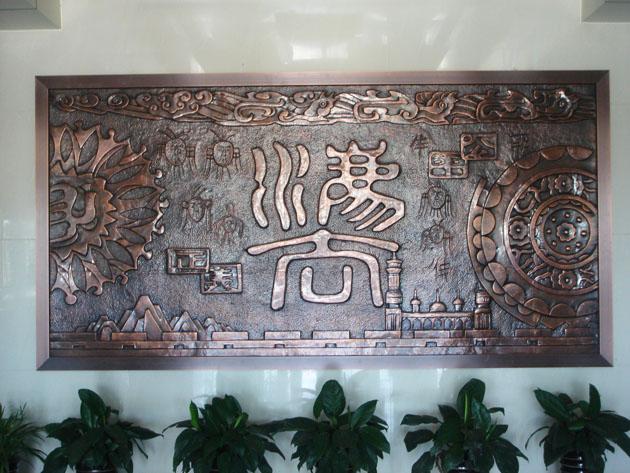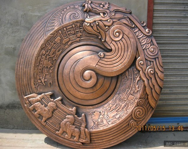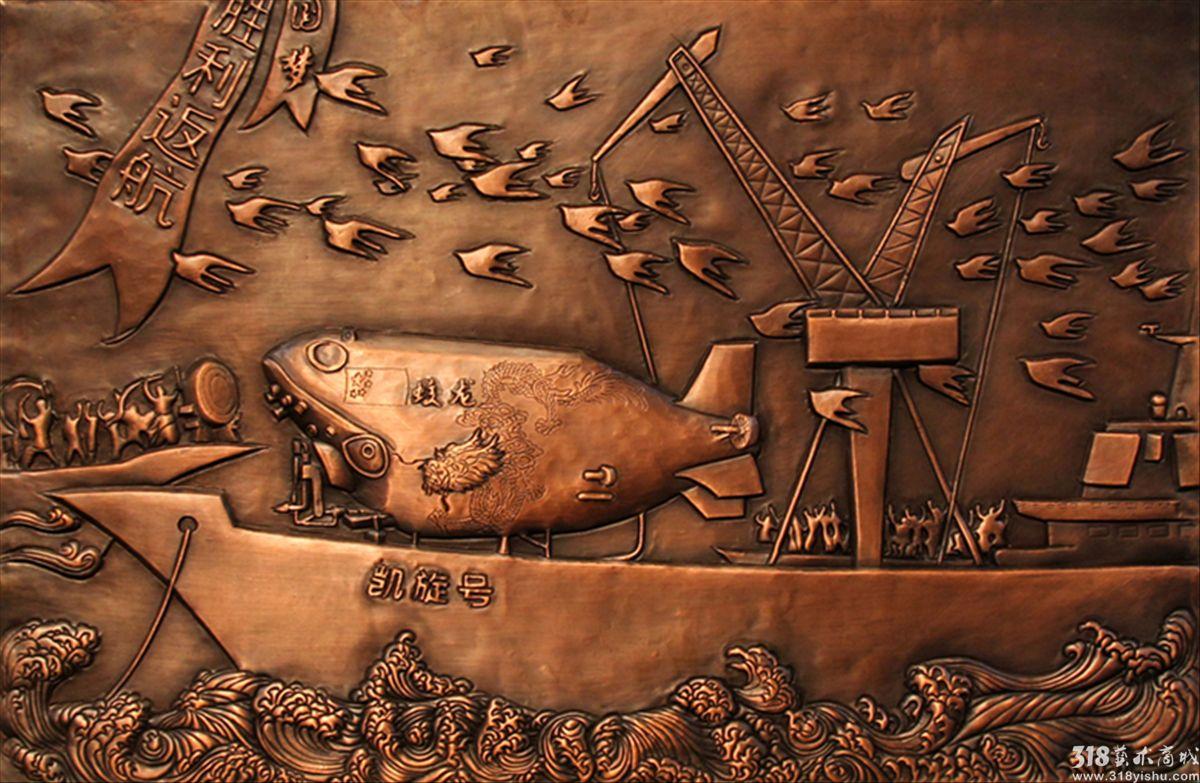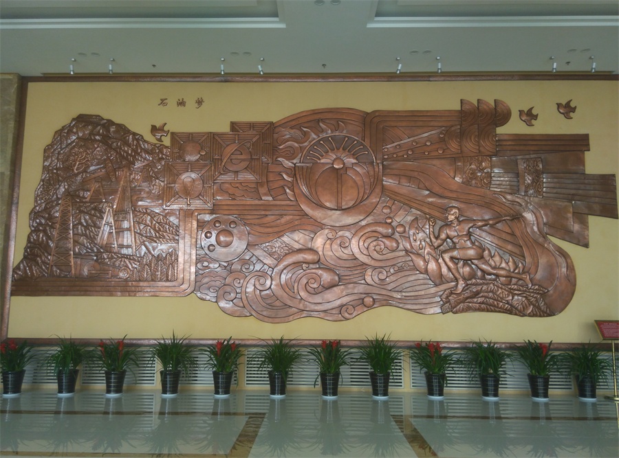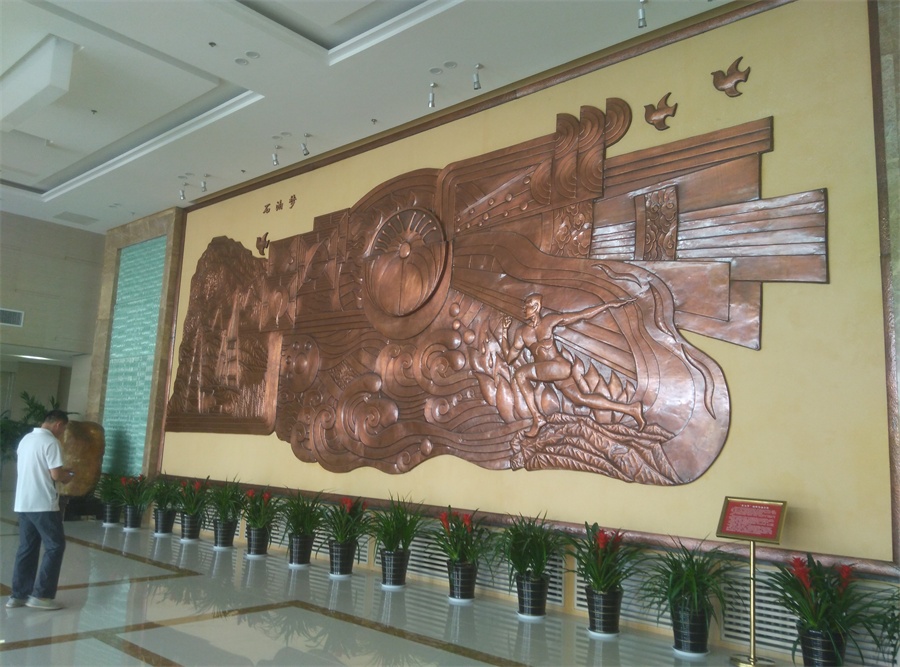 鍛銅雕塑,鍛銅浮雕展示。鍛銅浮雕(又叫鏨銅或敲銅),是利用銅材料的延展性興起來得鏨刻工藝,是我國傳統(tǒng)手工藝百花中的一枝奇葩。鍛銅雕塑的制作過程是先做出一個模子,然后用特制的膠粘在固定位置上,將銅板加熱后質(zhì)地變軟的銅板放在模子上用錘子進(jìn)行敲打,敲打后又恢復(fù)堅(jiān)硬,這樣便可以成形,然后進(jìn)行著色處理,最終制作出藝術(shù)作品。